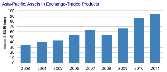 アジア太平洋地域では、取引所取引商品(取引所取引ファンドや取引所取引コモディティなど)に組み込まれた資産が2003年以降、毎年(世界全体が金融危機に見舞われた2008年は除く)増加してきました。アジア市場には大きな成長の可能性が潜在しています。