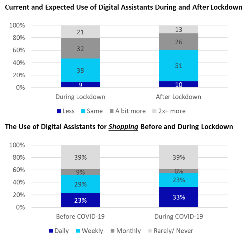 Voxly Digital, a software development agency focused on voice experiences, surveyed 400 UK-based consumers that use a voice assistant (e.g. Amazon Alexa, Google Assistant) during the COVID-19 lockdown in March. 53% said they used voice assistants more during the lockdown than before, with 21% saying their usage went up at least twice as much as before. Furthermore, 40% of users predicted they will also use voice more once the crisis is over than they did before. Finally, the percentage of those that use voice for shopping at least daily rose from 23% before the lockdown to 33% during it. The somewhat surprisingly high figures of daily shoppers can be explained by the fact that the respondents were all existing users of voice assistants, while around three quarters of the UK households don’t yet own a smart-speaker. Nevertheless, they do show that there is a clear demand for voice-based commerce.