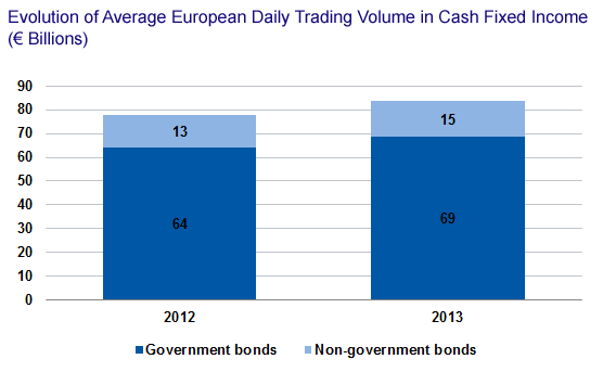 If global outstanding debt has grown by just 1% between March 2012 and December 2012, European outstanding debt has decreased by 0.1%. Japan is also decreasing, but the US, EMEA, and other countries have growing outstanding debt. However, we estimate that the European secondary trading activity is back on track, having grown by 8% between 2012 and 2013. In 2013, European average daily value in government bonds is estimated at €69 billion overall, up by 7% vs. 2012 levels at €64 billion. We estimate European nongovernment bonds ADV is also up by 10% from 2012 levels to €15 billion in 2013.
