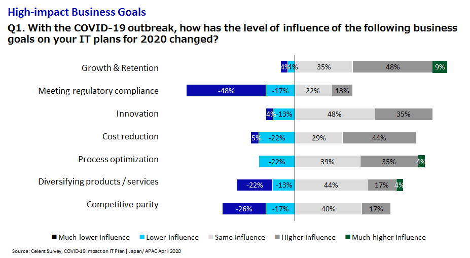 In APAC countries, too, the responses collected after the lockdown or the announcement of IMF’s International Macroeconomics Indicator were greatly different from the responses before them. Many APAC financial institutions, concerned about the stagnation of cross-border transactions, delays and failures in global supply chains, including IT resources, in addition to the slowdown of their own economies, said they were reviewing their IT sourcing models, including how to respond to crises in their IT development and operations.