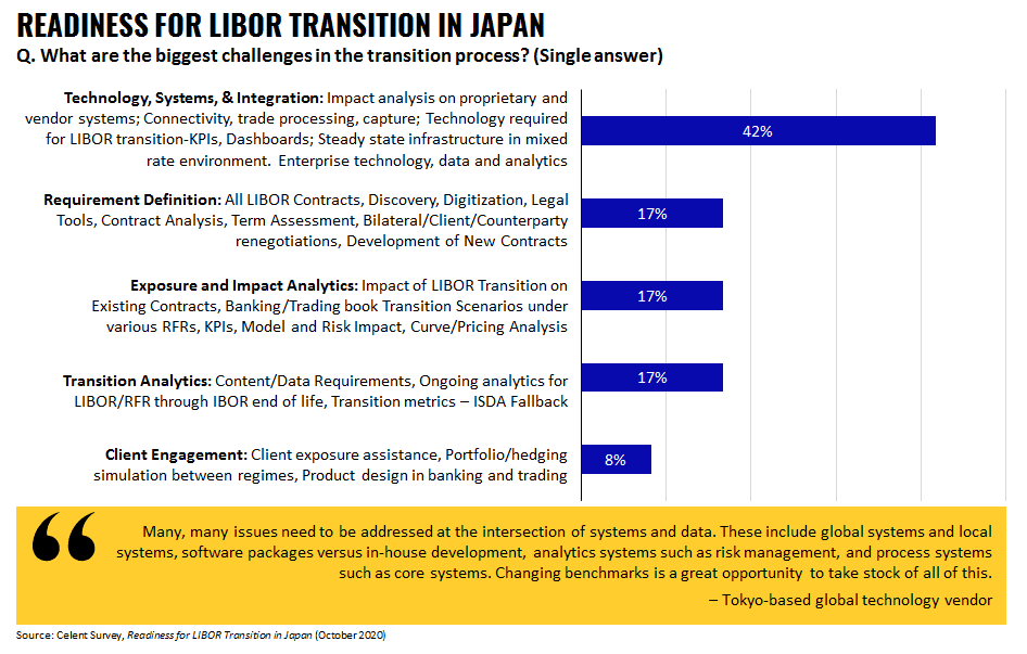 To understand the impact of the LIBOR transition and the financial implications for Japan and the Asia-Pacific region better, Celent continues to conduct online surveys and interviews targeting financial institutions and IT vendors. This report features an analysis of LIBOR transition readiness in Japan-based financial markets on the survey “Navigating the LIBOR Transition: Using IT to Adapt to the New Normal.” The survey was conducted in the fall of 2020 with the participation of more than 30 financial services and IT professionals in Japan/APAC.