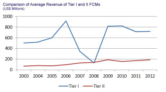 Tier II firms seemed to have coped much better than Tier I with regard to the crisis and its aftermath. Between 2003 and 2012, their average revenues declined only in the years 2005 and 2010. What’s more, 2012 had marginally higher overall Tier II revenues than 2009—a different result than Tier I firms and the industry as a whole.