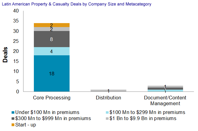 Vendor software deals in the emerging Latin America insurance market were primarily smaller insurers for comprehensive administration suites.