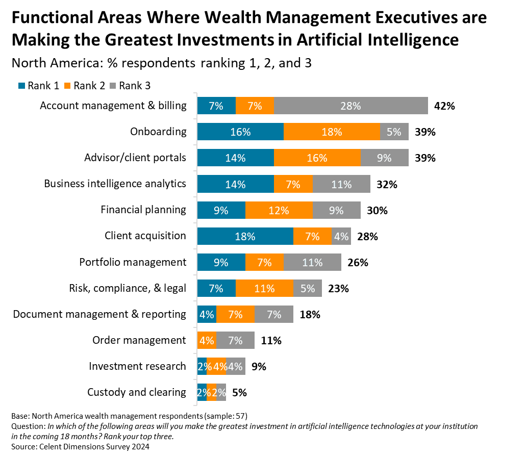 The most common areas seeing the greatest investments in AI in wealth management are 1) account management and billing, 2) onboarding, and 3) advisor/client portals. Client acquisition is the most common answer ranked number one for the greatest AI investments. During the webinar, I plan to dive deeper into how advisors are leveraging AI (and generative AI) to enhance the customer experience.