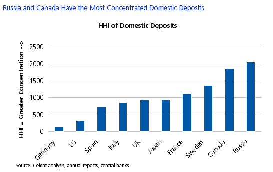 Greater bank concentration makes the industry more difficult to insure. A common measure of market concentration is the Herfindahl-Hirschman Index (HHI). Celent examines the HHI in banking for various countries and finds only two where bank concentration could be anticompetitive: Canada and Russia. In spite of its growing concentration, the United States it remains one of the least concentrated markets Celent examined.