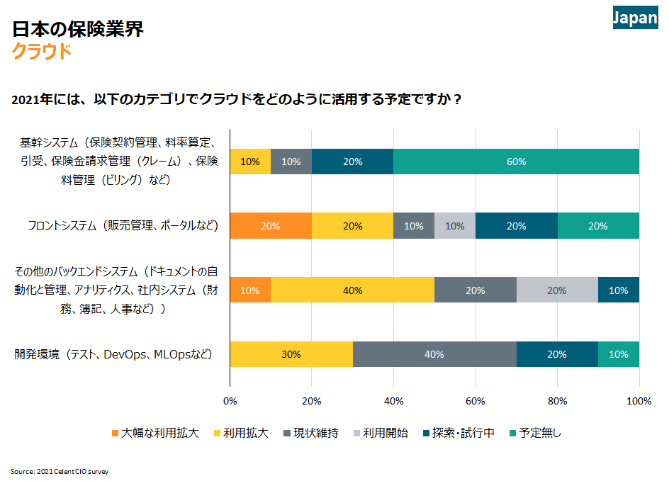 セレントは毎年、日本、アジア太平洋、欧州、中東、アフリカ、中南米、北米を含む世界各地の保険会社のCIOを対象に調査を行っている。直近のCIO調査は2020年12月から2021年2月にかけてグローバルに実施し、世界各地域の保険会社(総合保険会社、生命保険または医療保険会社、損害保険会社)のCIO、CTOまたはアーキテクトから回答を得た。参加した保険会社は、事業規模という点で市場構成を適正に反映していると考えられる。本稿は、日本と各地のCIOの優先課題と取り組み、その相違点と同質性について分析している。
