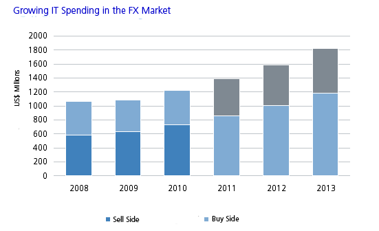 The success of FX is tied to higher IT spending. Competition for market share has resulted in larger banks scaling up their investments. Smaller banks have been pressed to come up with innovative approaches, and we see them moving towards providing niche offerings such as specializing in specific derivatives or currency pairs, or focus on specific segments of customers like hedge funds and asset managers.