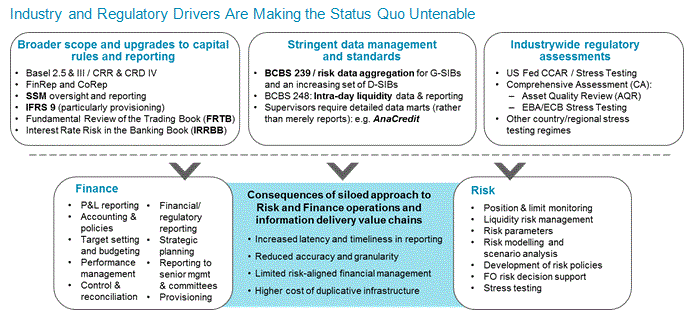 Market, structural, and regulatory forces continue to shape the financial industry’s future and its evolving search for sustainable business models. The industry has come a long way since the financial crisis, but there is much work to be completed. Post-crisis regulatory reforms are expected to drive risk management and related regulatory compliance spending in 2015 to exceed $50 billion globally, with the average expenditures of a Tier 1 bank standing in excess of $0.5 billion. Accounting rules, capital regimes, and regulatory stress tests are increasing in scope and depth, with regulators requiring firms to demonstrate strict data management practices and stringent standards.