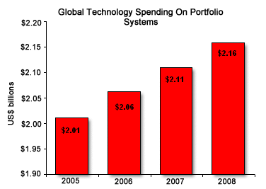 | New York, NY, USA August 17, 2005 Celent anticipates that the global portfolio systems market will reach US$2.2 billion by 2008. Portfolio Systems serve as the core infrastructure for investment management firms and divisions of banks and insurance companies. In the report " ," Celent compares 12 portfolio systems available in the US and Europe, explores the major trends in the marketplace, and details the latest features and functions of portfolio management systems. The portfolio systems market is booming as a result of technological advances and new entrants in need of portfolio applications. Celent predicts that the global portfolio systems market will reach approximately US$2.2 billion by 2008, which is a modest 7.3 percent cumulative growth rate from 2005 to 2008 (See Figure 1).