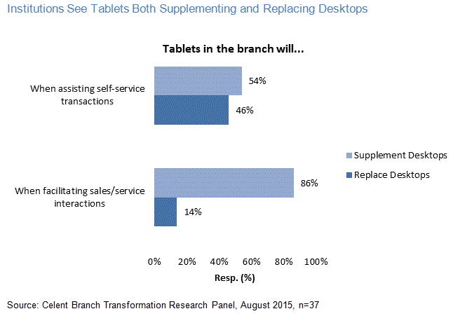 A June 2015 survey found that over 60% of institutions felt that tablet usage by front line branch personnel would be “extremely likely.” The August 2015 survey explored how tablets would be used and found that institutions are planning to both supplement and replace desktops. Tablets will soon be used to facilitate sales and service interactions as well as to assist self-service transactions.