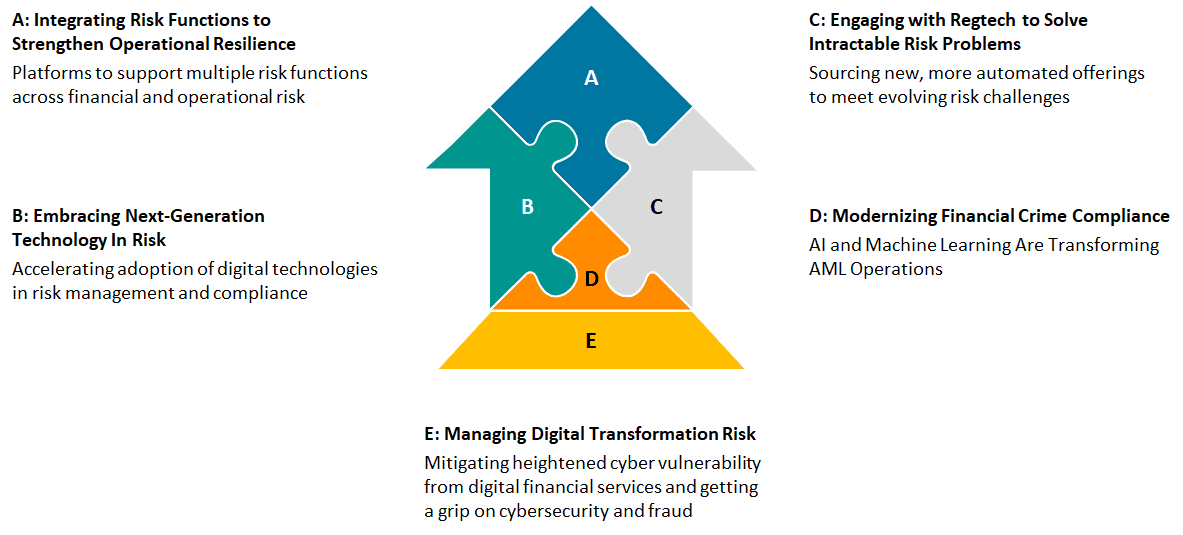 These and other emerging challenges are requiring financial institutions to step up use of digital technologies, AI, and alternative data to monitor financial and operational risks and update scenarios in real time in order to deal with fast-moving events in a volatile world. Compliance operations are adopting AI, software robotics, and other digital tools and data in order to drive much-needed increases in the efficiency and efficacy of financial crime operations. A rapidly developing ecosystem of agile, cloud-native regtech solutions as well as investments in next-gen capabilities by incumbent technology providers will support the digitization and automation of financial crime operations.