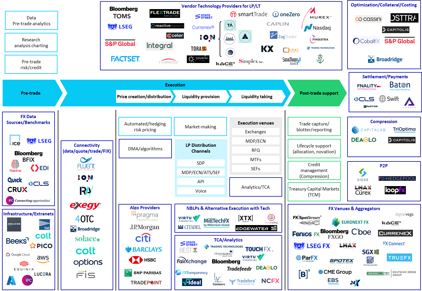 The FX technology solution and venue ecosystem is a mixture of financial technology firms and trading venues with multiple models of FX execution, venue, and aggregators, and specialty fintech