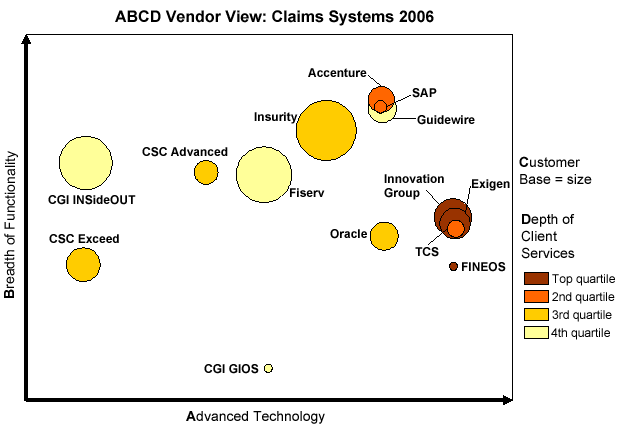 In a new report, Core P/C Claims Systems Vendors 2006, Celent looks at 16 P/C Claims solutions from 14 vendors. The report features Celent痴 ABCD Vendor View. The ABCD Vendor View presents a comparative view of the vendor marketplace that visually represents four elements: Advanced technology and technical flexibility, Breadth of functionality, Customer base, and Depth of client services.