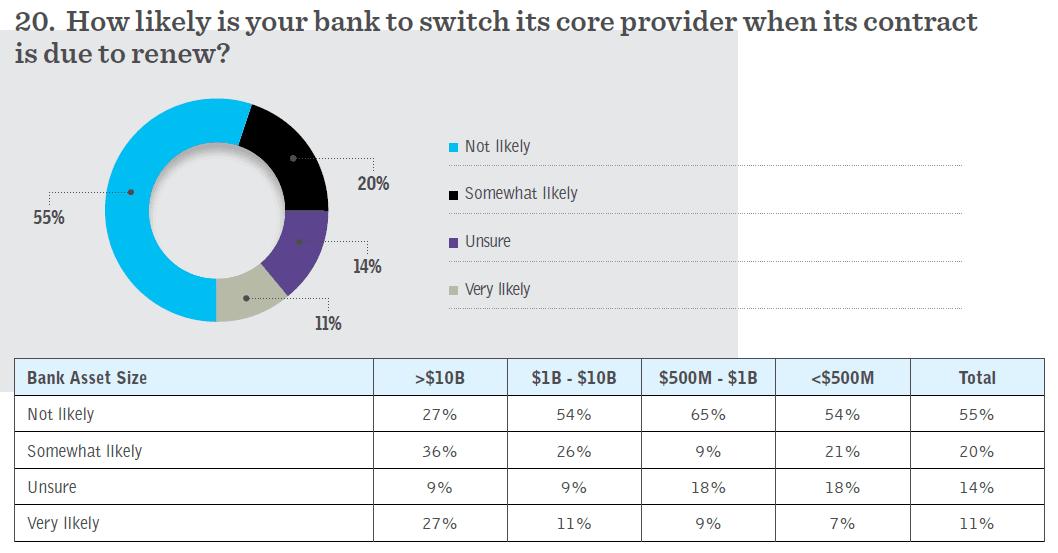 Bank Director recently released its annual Technology Survey, a fantastic look at the attitudes and actions of bankers in the US. The survey was issued in June and July of this year and explored investment priorities, reactions to COVID, IT spend, among other topics. These surveys can offer incredible insight into where the industry is heading and trends to watch. One specific question on core banking caught my eye. See below:
