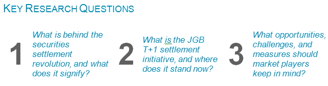 This report examines the efforts planned and in progress to shorten the settlement cycle of Japanese government bonds (JGBs) from two business days after the trade date (T+2) to one (T+1). This series of reports on the so-called “securities settlement revolution,” will focus on key trends and changes in the securities settlement market of Japan while exploring legacy systems and ecosystem migration as well as the related possibilities of innovation and emerging technologies in this context.