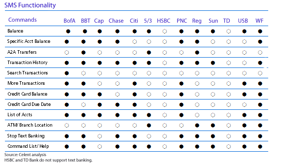 In the report What App, Doc? A Biannual Evaluation of Mobile Banking at the Top US Banks, Celent looks at the top 13 US retail banks by asset size and evaluates and scores each of their mobile offerings based on a number of criteria. Platforms include iOS, Android, Mobile Web using the Safari browser, and SMS.