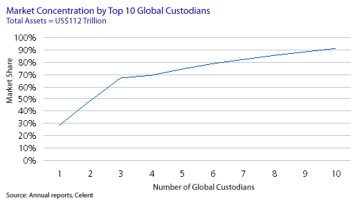In terms of the level of market concentration in the global custody market, the top three firms control 67% of the market, while the top 10 firms together control 91% of the global market. Although the level of concentration is similar to levels a decade ago, we are now seeing a decrease in the number of players in the global custody market due to consolidation and the financial crisis, resulting in less choice for consumers.