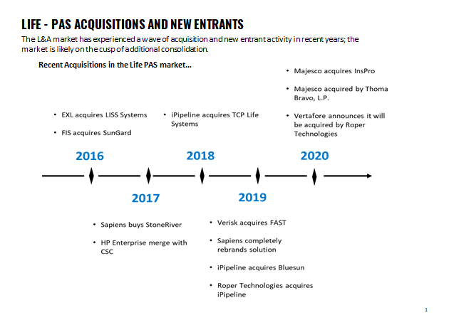 The sustained wave of M&A activity demonstrates how vendors and investors are responding to that demand in the Life and Annuity PAS market. It also may indicate the how vendors and investors perceive increasing their value to insurance companies with providing a full suite of solutions.