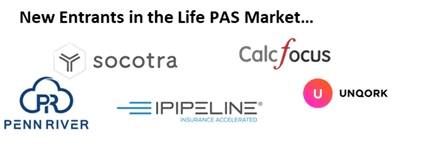 The same goes for the new entrants in the field. New PAS providers and low-code/no-code platform providers are invading the space. Calcfocus with Achieve, iPipeline with SSG Digital, Penn River, Socotra and Unqork just to name a few.