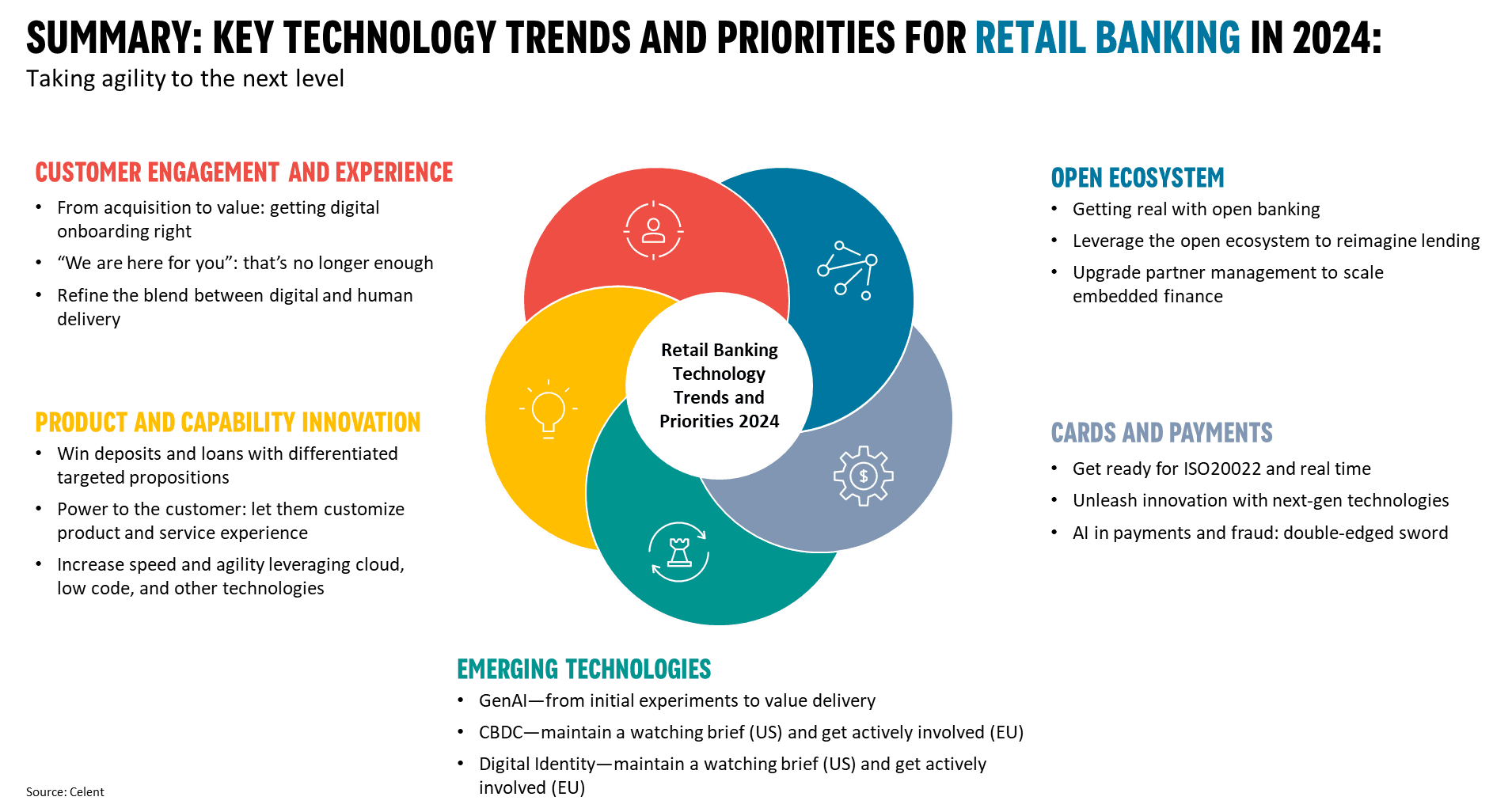 This report summarizes Celent’s guidance to clients around five key industry themes and 15 retail banking technology priorities for 2024. The five themes are consistent across retail and corporate banking and will guide our research agenda for 2024. As always, the report draws on some of our recently published insights, but much of the content is new, published here for the first time.
