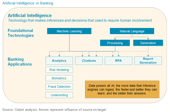Artificial Intelligence (AI) is extraordinarily popular when judged by today’s banking headlines, but those headlines have outpaced today’s practical banking reality. Relatively few banks have begun production or even full-blown research at this stage, so Celent seeks to provide an introduction and path forward for banks studying this hot topic. We take a pragmatic approach that defines AI in banking as technology that makes inferences and decisions that used to require direct human involvement. A series of fundamental and interrelated technologies around machine learning and natural language underpin all of AI. Crucially, AI is not just automation or better technology. It is not faster processing, bigger data sets, or even thousands of rules rigidly applied. These advances have yielded powerful results, but they’re performing old tasks better. That AI can respond to ambiguous real-world inputs probabilistically is one of its critical features. Building off the fundamental technologies to apply them in a banking context yields four main AI applications today: analytics; bots; robotic process automation (RPA); and report generation.
