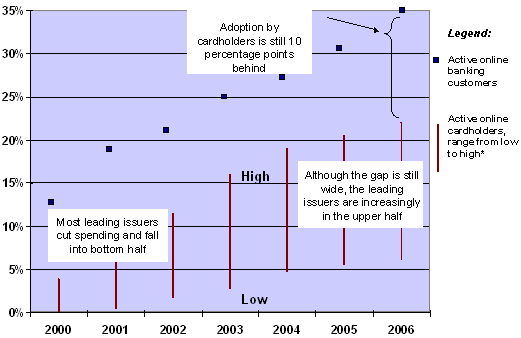 | San Francisco, CA, USA January 5, 2005 Celent Communications evaluates the state of online cardholder sales and services and finds that while there are clear best practice players, the majority of issuers are behind the curve. Are there any new frontiers in online financial services? Surprisingly, there are, right under the noses of IT- intensive card issuers. While issuers have customer segmentation and product manufacturing down to a fine science, distribution and customer care remain seemingly old-fashioned and reliant on one channel for customer acquisition (direct mail) and another for customer service (call center/AVR). The fact that most card issuers have not put significant effort into their online cardholder services is evident in relatively low adoption. There are as many active cardholders online now as there were active online banking users in 2002.