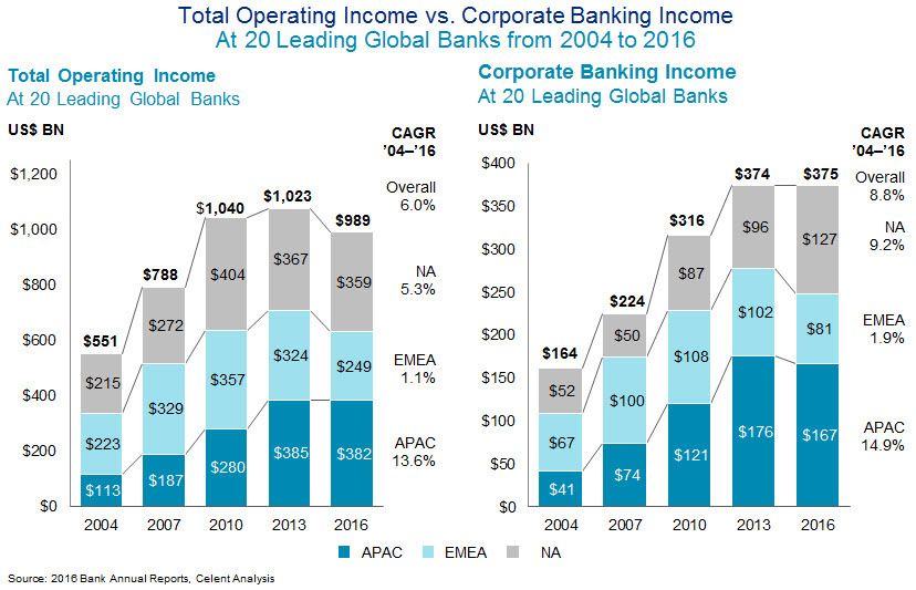 Corporate banking continues to play a dominant role for the largest global banks, with operating income growing year-over-year since the global financial crisis. Corporate banking operating income growth also continues to outpace total operating income.