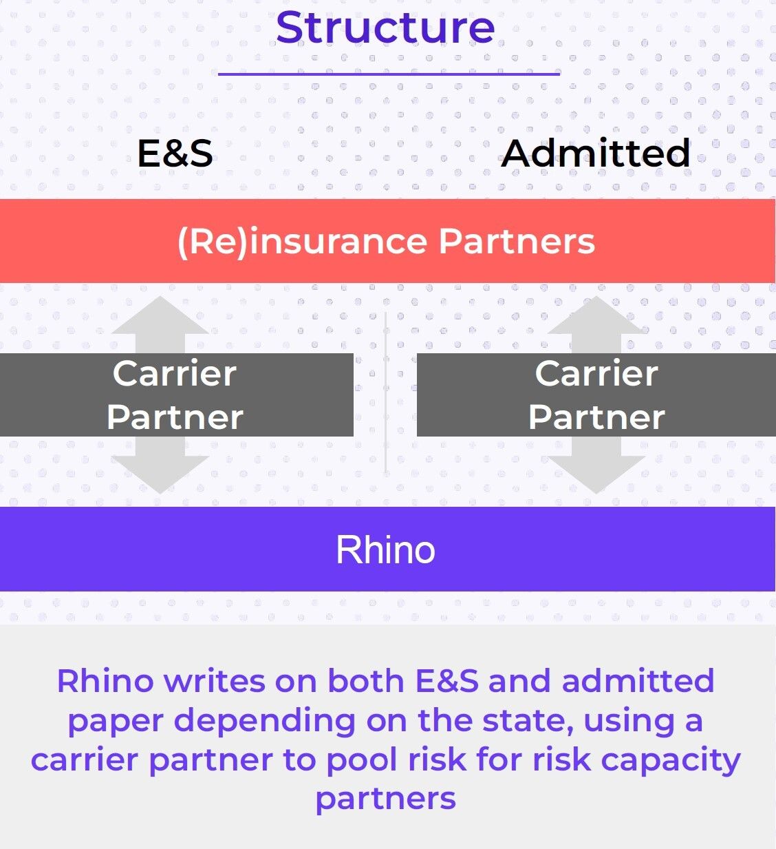 - Rhino offers security deposit insurance to new tenants of large rental property owners. One of Rhino’s key value propositions is implementing a Rhino-specific renter facing experience, which is natively embedded within the property leasing process, and making real time accurate pricing and underwriting decisions. Rhino is a distribution partner for both E&S and admitted insurers.