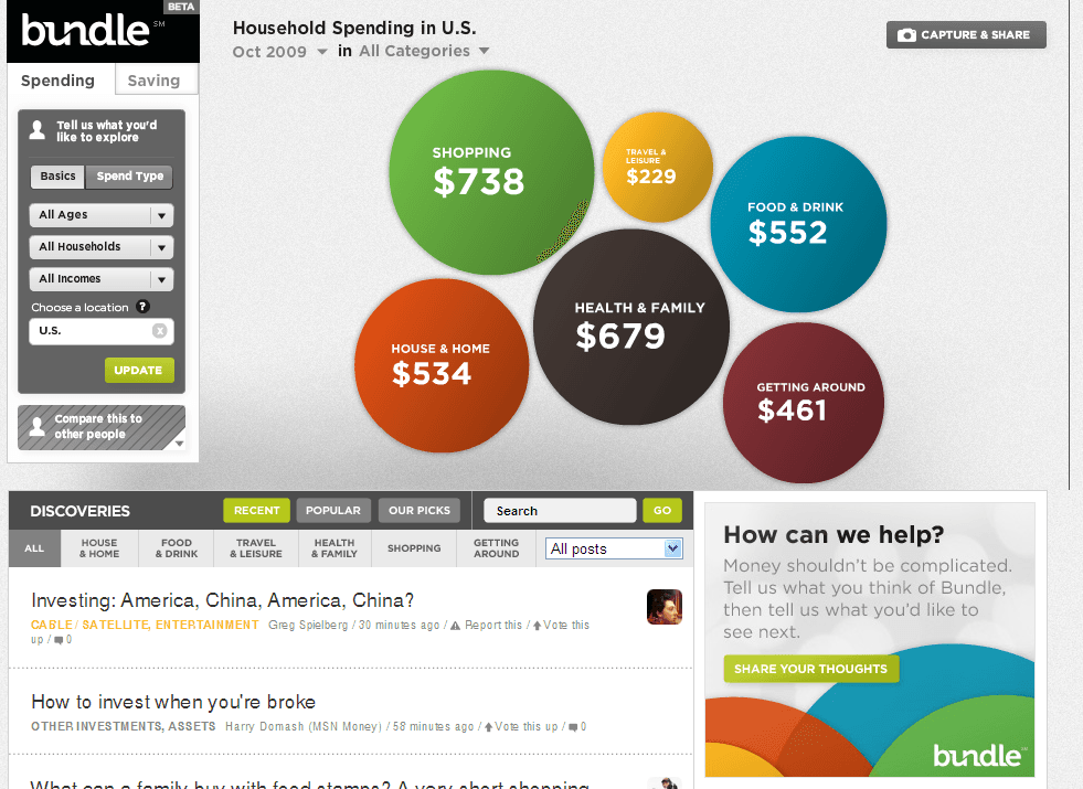 Back in late September 2009, rumors were flying regarding a Citi and Microsoft venture in the personal financial management (PFM) space. It garnered a lot of attention, particularly due to Microsoft's decision to exit Microsoft Money online. Folks were very curious, myself included, as to what these two heavyweights would conjure up. The rumors were true, and late last month, Bundle.com was launched. Citi, Microsoft, and Morningstar are investors in the new venture. Jaidev Shergill, formerly of Citi Ventures, is the CEO. I visited the site with the expectation of finding a potential contender in the PFM space. Instead I found a site that provided a very limited view into personal financial management. The site allows users to compare their spending habits with others around them or in other areas. There is also a community where users can interact with one another and discuss personal finance. I like the ideas of spending comparisons but this is not a new feature. It has been offered by Mint.com, Wesabe, and Geezeo for some time - all offer various flavours of community and social interaction. I see spending comparisons as a nice to have, not an absolute requirement (see my blog entry on this). I don't believe that folks should model their spending habits according to others for one simple reason - most people don't have good spending or budgeting habits. Everyone needs their own custom-made plan. Bundle.com is going to need to add a lot more to its portfolio in order to attract users and keep them coming back. Bundle is still in beta, and it will be interesting to see what else they add to the pot. I am also curious to see if Citi will begin to integrate any of the features into their own offerings.