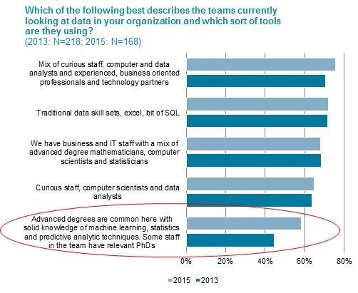 We came across an interesting article recently in the Insurance Journal that said insurers needed to hire more Big Data professionals. While we agree with this statement, we have already noticed in the early results of our 2015 survey (still in progress) that insurers have now more data scientist experts as shown in the following figure: