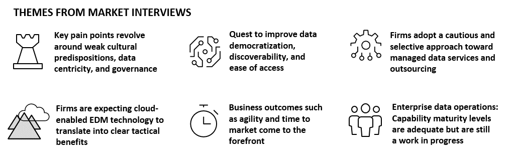 投資会社はレガシーシステムへのプレッシャー軽減、コスト合理化、進化する顧客ニーズへの対応、リスクおよびコンプライアンス要件への対応など、より幅広い目標をもって戦略的データイネーブルメントに注力すべく、テクノロジー投資の優先事項について継続的に見直しを行っている。戦略的に重要とはいえ戦術的にはまだ難しい分野であるエンタープライズ・データイネーブルメントのプラクティスとテクノロジーは、再び注目を浴びている。