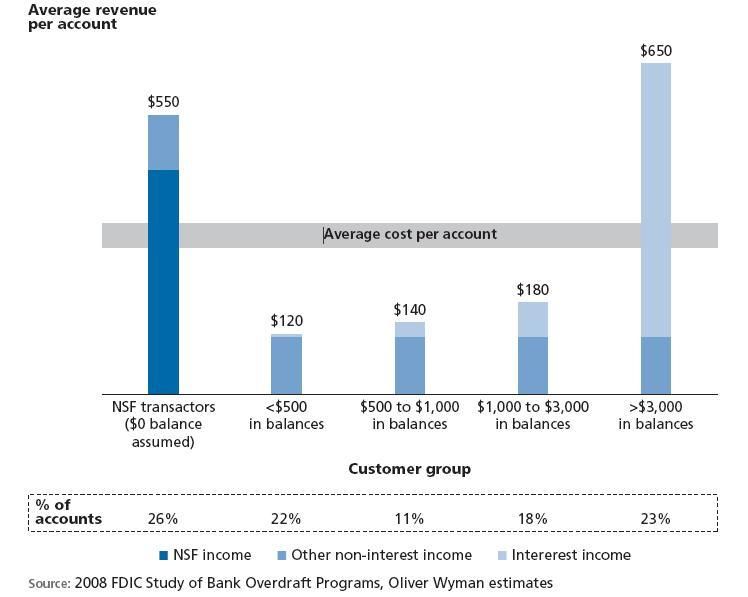 The most profitable DDA customers are those at the top of the scale who keep large balances and provide low cost deposits, and those at the bottom of the scale who keep very low balances and generate NSF or overdraft fees. They subsidize the other half of customers in the middle who neither keep large balances nor bounce checks.
