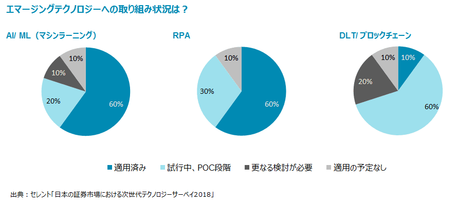 世界中の資本市場で、取引所関係者と市場参加者は、エマージングテクノロジーの評価と適用に取り組んでいます。セレントが先に発表した「世界の取引所CIOサーベイ」(2018年7月)によると、クラウド、AI(人工知能)、RPA(ロボティック・プロセス・オートメーション)、ブロックチェーンへの取り組み状況は、「適用済み」と「試行段階」を合わせた「取り組み中」の割合で、それぞれ70%以上と高い水準に達しています。