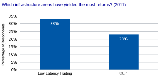 2011年にブルームバーグが世界の主な金融機関のシステム投資担当者を対象に、前年度のインフラ投資のうちどの分野が最も高いROIを生み出したかを調査したところ、回答者の33%が取引の待機時間短縮、23% がCEPと答えました。このように、金融機関がCEPを利益創出手段として重視していることが明らかになりました。
