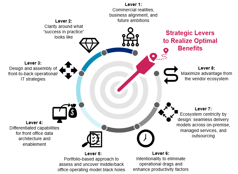 システムやオペレーションの合理化、自動化、およびアウトソーシングにエコシステムアプローチを採用している企業は、次世代のデジタル機能、自動化機能、高度なデータ/アナリティクス機能に支えられたフロントオフィスとミドルオフィスの活動全体において、今後3~5年で平均30%のコスト削減を実現できると当社は予測している。通常、企業はコストベースの10~20%をデータ管理とオペレーションに費やしているため、自動化とデータおよびアナリティクスの有効活用がコストを削減する最大のレバーとなる。
