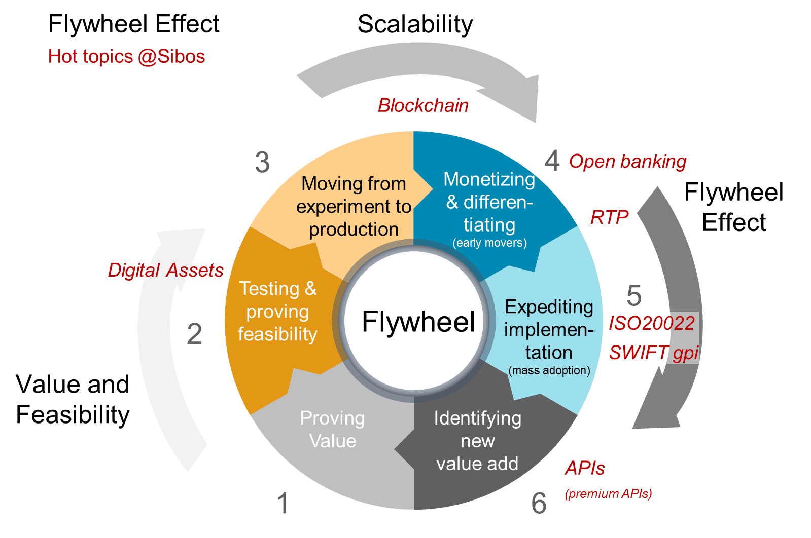 Top trends on the flywheel – in terms of the beat @Sibos overall: PROGRESS. No eyebrow raising announcements or tech breakthroughs but rather material, incremental progress across a variety of initiatives. Progress is being propelled by steady growth in collaboration between banks, fintechs, big tech, and market infrastructure providers. A useful way to summarize the progress of the top initiatives discussed @Sibos is their position on the “flywheel.”
