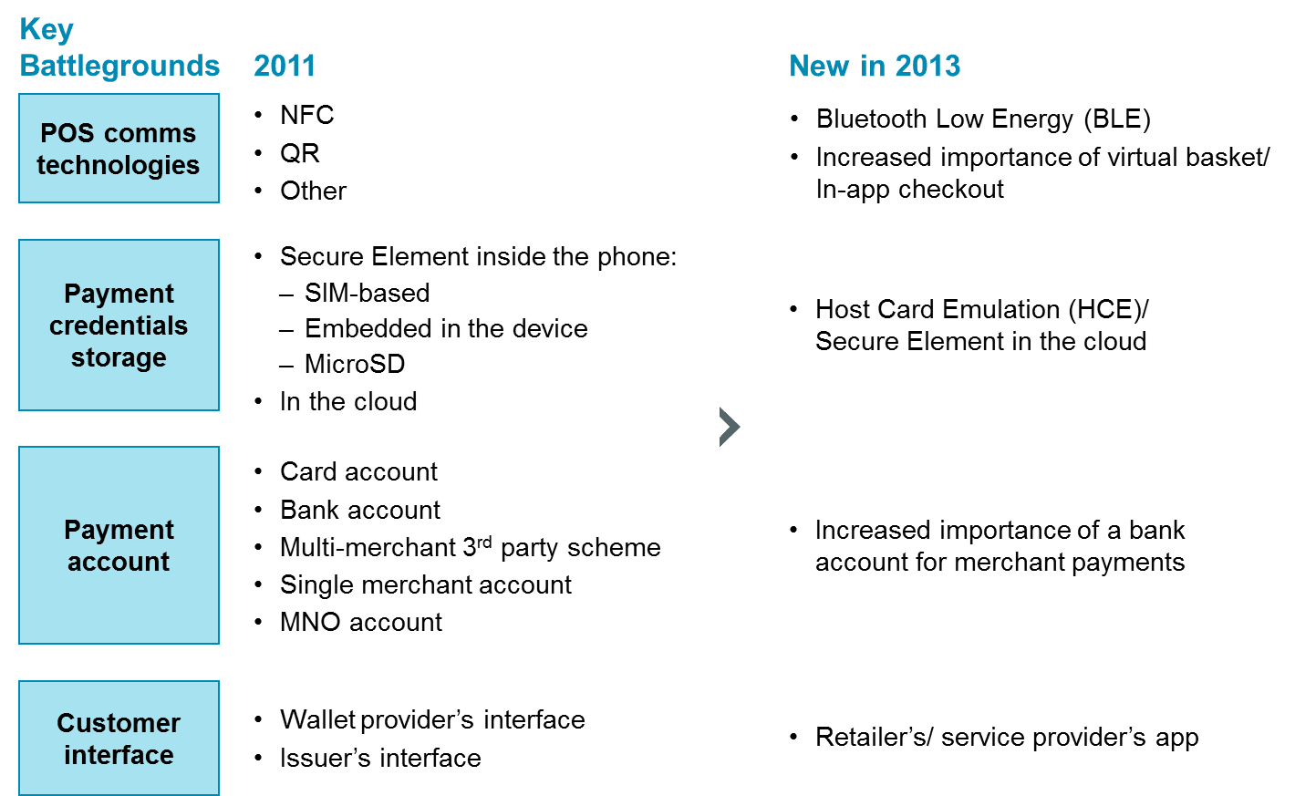Last week we published our annual report on Top Trends in Retail Payments, which looks back at 2013 and calls out the main themes to watch for in 2014. In 2013 we observed interesting developments in each of the four dimensions defining the battleground for mobile payments - see the chart below. Starting with customer interface, we are seeing the rise of mobile apps from retailers and service providers. These apps focus on adding a digital layer over service provision with seamlessly integrated payments capability. We call this trend “contextual payments” – recognising that customers engage in a broad set of activities and ensuring they are able to pay in any context, while acknowledging that the actual service provider is likely to offer a richer digital experience and customer interface than a generic open payments wallet.