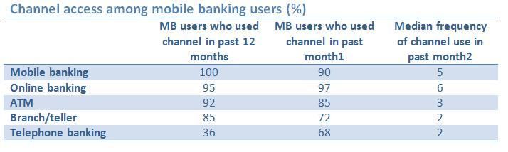 - While mobile banking users are using the platform frequently and consistently, they also interact with their banks through more traditional branch and ATM channels. 72% of mobile banking users frequented a branch in the past month.