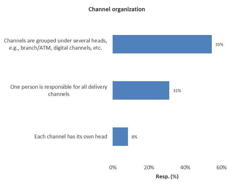 *As mentioned in an earlier blog, the persistence of the “branch is dead” debate seems to be to betray the deeply invested interests on each side of the debate. In many financial institutions, digital and physical channels still have separate reporting structures (Figure 1). In Celent’s October 2014 survey of North American financial institutions, we found that less than a third of responding FIs have a single person responsible for all delivery channels. Interestingly, this appeared to be more likely among large banks.