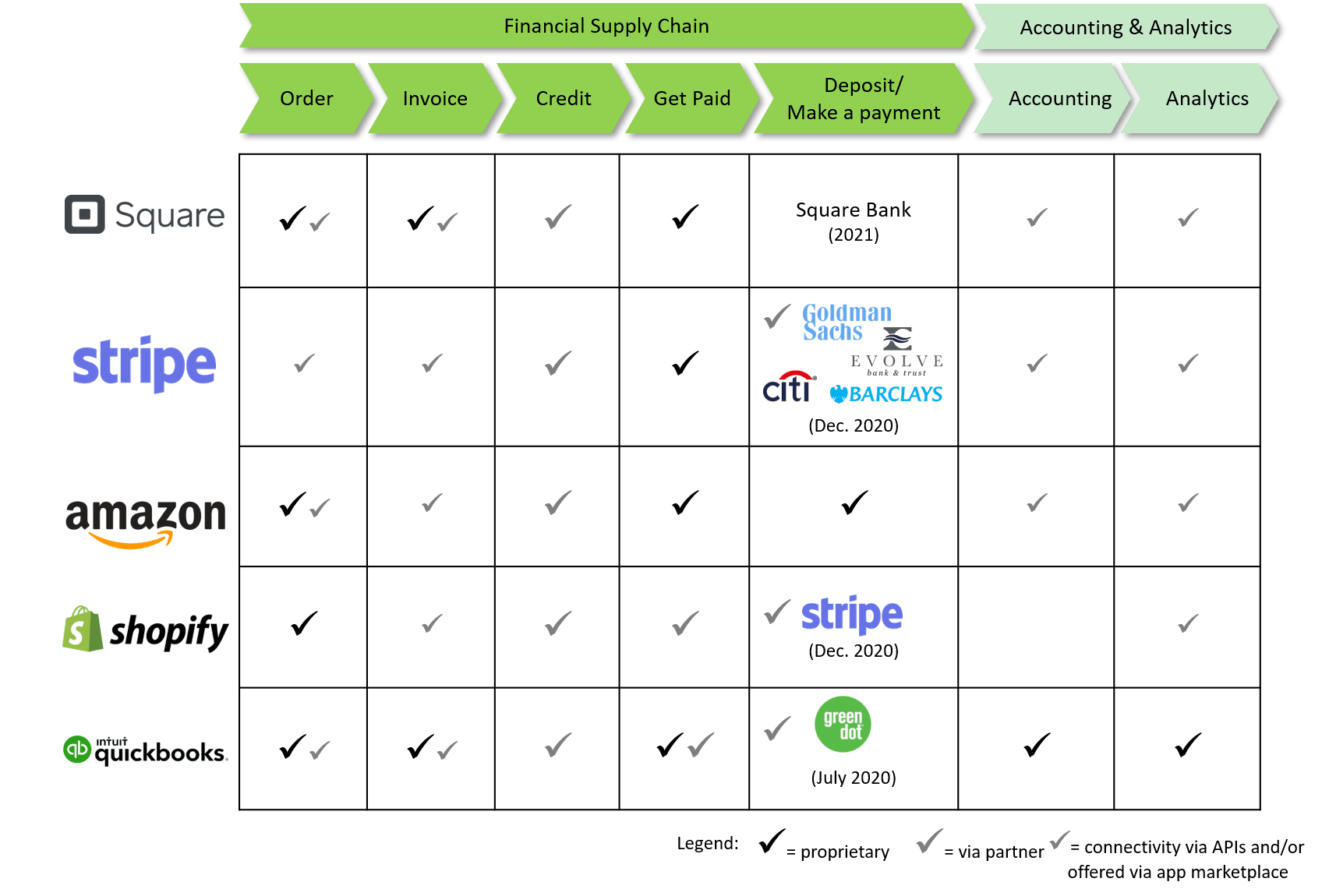Reinvention translates into supporting each chevron in the financial workflows of small businesses and embedding banking services. With the addition of a deposit account these platform players are nearing the finishing line.