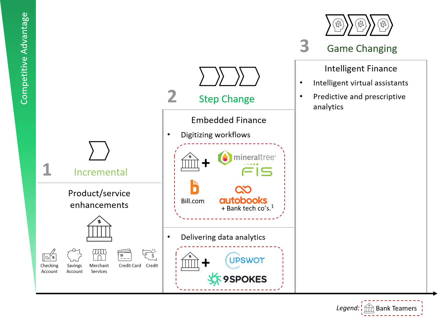 In my report, Reinventing Small Business Banking Part I: Pacesetters in Embedded Finance, I outline how banks can become “quicker, better, faster.” I delve into the important role partnerships can play and profile seven potential bank partners. Five are digitizing and simplifying workflows: Autobooks, Jack Henry & Associates (JHA) (which has embedded Autobooks in several of its solutions), Bill.com, MineralTree, and FIS (whose Invoice-to-Pay is powered by MineralTree). Two are delivering enhanced data analytics: 9Spokes and Upswot.