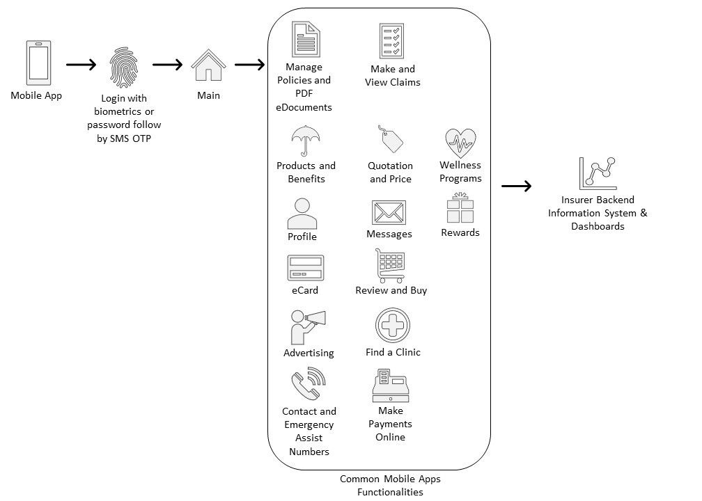 The apps provide low learning for users and allows biometrics, which tapped on existing phones biometric features, to be authenticated into the app. Biometrics can replace user names and passwords which can be forgotten and pose fraudulent risks. For additional security, an SMS or email one-time password (OTP) is sent to the user’s mobile phone for further authentication. The apps will take the colour scheme of the insurers and uses simple icons to display functions, mostly displayed on the main screen. A hamburger button on the side will lead to additional menu items such as settings and user profiles.