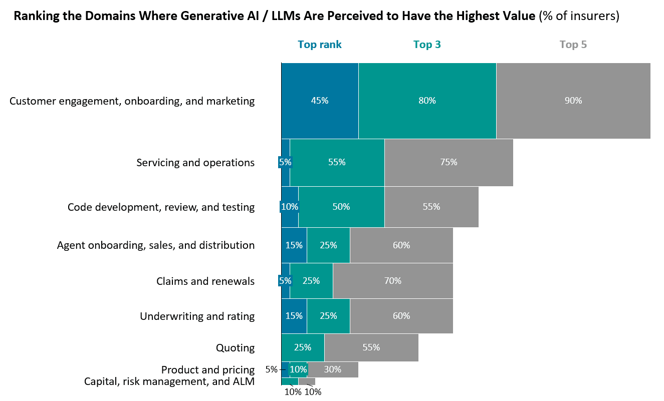 ほとんどの生命・医療保険会社は、顧客エンゲージメントとサービシング業務が生成AIと大規模言語モデルにとって最も価値のあるビジネスケースであると考えている。