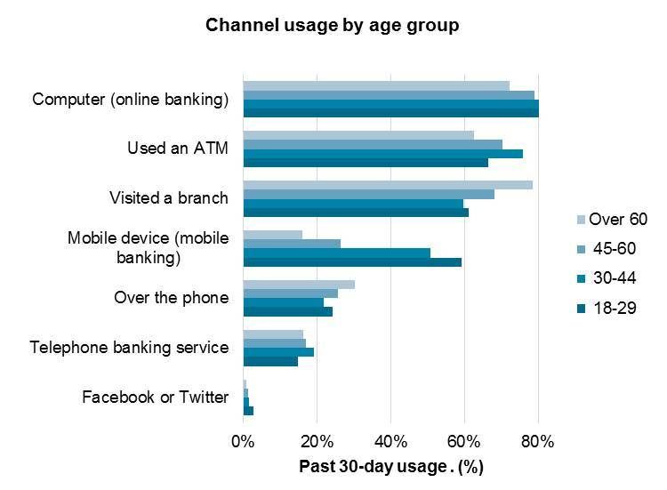 Bank Innovation published a piece written by Brett King this week entitled, Can we Stop Talking about the ‘Branch of the Future’? In the article, King cites the industry’s use of the “branch of the future” terminology as evidence of “one of the key hang-ups that banks have over changing distribution models”. In other words, an inordinate amount of effort expended to “save” an obsolete delivery model. He argues that pursuing a “branch of the future” strategy, banks avoid the real work of improving customer engagement via digital channels. I think that’s nonsense. These assertions may resonate with one heavily invested in Moven, a digital-only bank happily growing by serving a niche market. Most retail bankers know the world isn’t as simple as King asserts. The fact is, banks have more than one challenge ahead of them. Specifically: 1. Right-size the branch network. There are two important aspects to this imperative: first is to redesign the branch channel for its emerging purpose: selling and servicing, and away from its legacy — transactional delivery. The second is to reduce branch network costs (both densities and corresponding operating costs) to enable investment in digital channel development. 2. Learn how to sell and service using digital channels. Migrating low-value transactions to self-service channels is no longer adequate. Digital channels must become more self-sufficient. One important aspect involves learning how to engage customers virtually. In-person must no longer require a branch visit. 3. Catalyze growth in self-service channel usage. For the second mandate to have maximum effect, banks must influence digital channel usage. Branch transformation simply isn’t optional as King suggests. Far from it! Why is Branch Transformation Imperative? Many reasons, but two are central in my opinion: 1. Most banks serve a diverse customer base, with widely varying and continually changing engagement preferences. 2. While customers increasingly transact digitally, they PREFER to engage face-to-face. Celent separately surveyed US and Canadian consumers in the fall of 2013, finding similar results. Contrary to what some would have you believe, young adults do visit branches. Both surveys found a rather weak correlation between age and channel usage – except for the mobile channel, which displays a strong relationship between past-30 day usage and age.