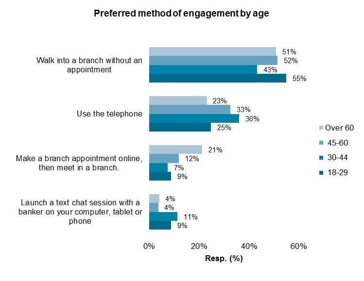 But, past 30-day usage is mostly about transactions, not necessarily engagement. The same two surveys asked respondents, “If you had an important topic you would like to discuss with a banker, how would you prefer to do so?” Responses to that question paint a very different picture – one that explains precisely why most banks derive the majority of their revenue from the branch network. Most consumers – regardless of age – prefer face-to-face interaction on important topics (at least for now). Interestingly, preference for online appointment booking was much stronger in Canada. Not surprizing, since several of the large Canadian banks have been offering (and advertising) the capability for nearly two years, while the same capability in the US is nascent.