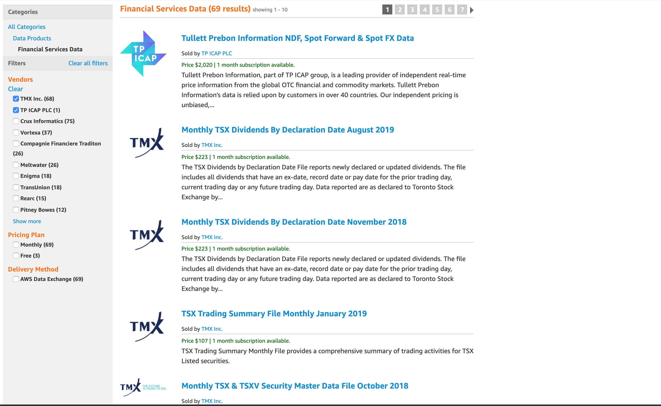 AWS Data Exchangeは証券取引所、ブローカー/ディーラー、オルタナティブデータプロバイダー、新興データソースからの1,000以上のデータ商品を含むサービスを開始している。以下スクリーンショットをご参照ください。
