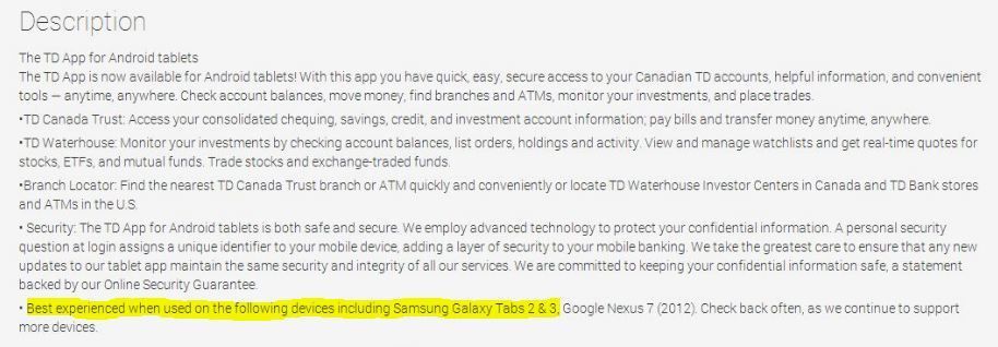 Banks are definitely struggling with Android and haven’t recognized its staggering growth. They have been quite slow to come out with Android Apps. Only 2 of the top 13 US banks have released Android tablet apps. Those that have released apps are running into issues. TD is the second bank I have run into that presented me with this device incompatibility issue – the first was Bank of America. TD’s Android attempt is even more puzzling. The bank has been busy with a new promotion geared at customers that open new accounts. Folks that open new accounts (and meet certain conditions) receive a brand new Samsung Galaxy Tab 3. The very same class of device I attempted to use the app with! At first I thought that TD simply hadn't optimized its app for these Samsung devices. That would be a no-no, especially since the bank has been handing them out to new customers. I did however take the time to read the detailed app information in the Google Play store. Apparently the app is “best experienced when used on the following devices including Samsung Galaxy Tabs 2 & 3.” I’m definitely left scratching my head in bewilderment.