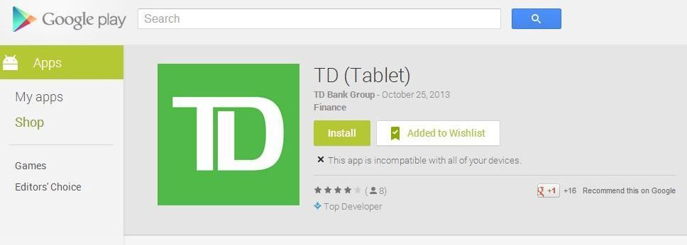We are just about to release a new report that evaluates the tablet apps from the top Canadian Banks. The space is expanding rapidly and banks are working hard at building and releasing new apps. Last week TD Bank Canada released a brand new app for Android tablets. Although the app wasn't ready in time for our review, I did attempt to take it for a spin. Unfortunately I wasn't able to. Google Play indicates that the app is incompatible with my Samsung Galaxy Tab 3 8.0.