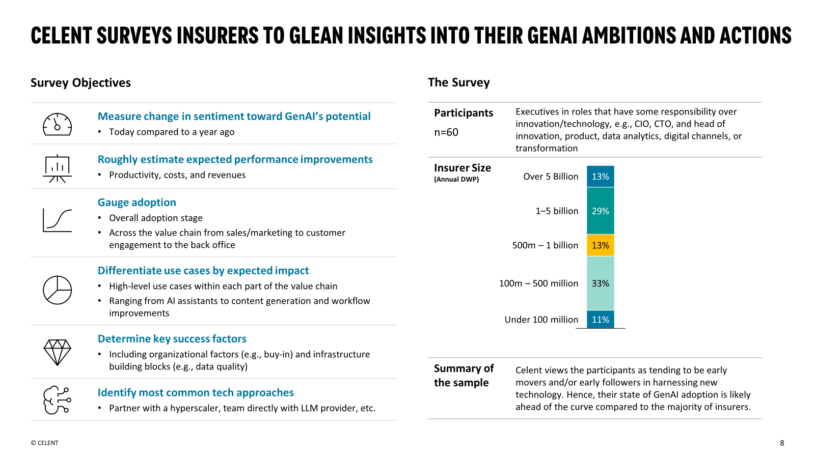 生成AIはムーンショットから現実のものへと急浮上している。保険会社における現状を明らかにするため、セレントは保険会社でイノベーションを統括する経営幹部を対象に調査を実施した。