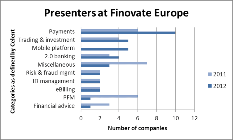Sometimes our blog entries are like London busses - you wait for a while and then two turn up in a row... This is my second entry this week, but I am back from travels and wanted to reflect on FinovateEurope, which happened earlier this week in London. For those who are not familiar with Finovate, it's an event where companies are given 7 minutes on stage to demonstrate their products and solutions. Many companies are start-ups, although sometimes large and established players are also there promoting their innovations. This was the second Finovate event in Europe and I was privileged to attend both. 2011 was good, but as expected, the 2012 event was even better. Many things stayed the same, such as the format, the number of presenters (35), etc., but it had a much bigger audience (and hence venue) and was even better organised. Without getting into too much detail and specific companies, what were the key take-aways? To help identify key themes, Celent defined the solution categories and assigned individual companies to the specific categories - the assignments, of course, are subjective and based on Celent's best understanding of the solution demonstrated and what the company does more broadly. Based on this categorisation, last year's event was dominated by Personal Financial Management (PFM) with 6 companies presenting their solutions in this area, whereas this year, only one firm was firmly in the PFM category. Also, there was only one company that was focused on Financial Advice this year vs three companies last year. This year saw the introduction of a new category - Mobile Platforms, which included five companies focused predominantly on developing mobile platforms which enable banks and other players to develop apps and other mobile services. Payments category grew from six to 10 companies this year, but the definition also broadened to include companies that provide card technologies or services to card companies - as a result, some companies, such as Cardlytics moved from Miscellaneous into Payments category this year. The Payments category also includes PayPal, which is obviously a payments company, although this time it did not demonstrate a payments innovation; instead, it showed a creative way to acquire customers and open new accounts. Overall, 12 of the 35 companies presented in both years, although often with new or enhanced solutions.